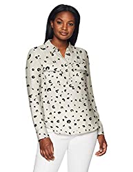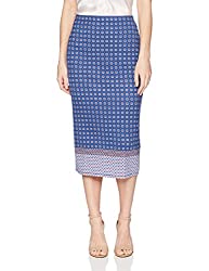 Items from left to right (Women's Printed Ponte Skirt, Women's Yarn Dye Stripe Woven Top, and Front Tie V-Neck Long Sleeve Top)
